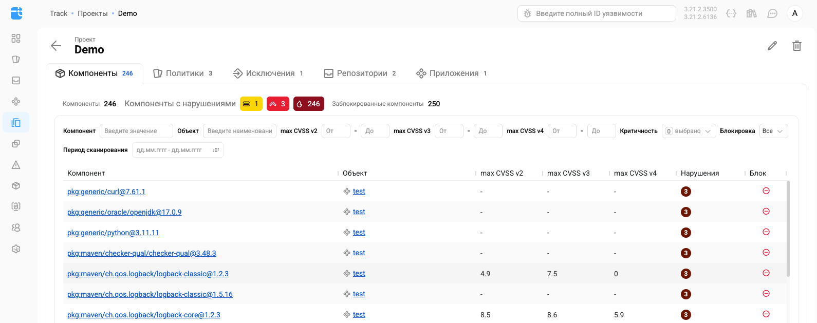 Страница проекта содержит несколько вкладок: Компоненты, Политики, Исключения, Репозитории и Приложения.